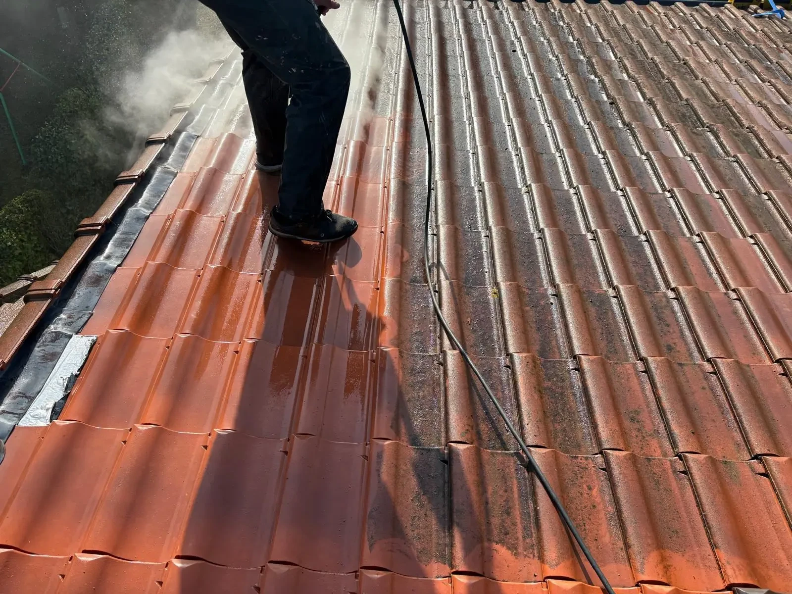 Nettoyage moyenne pression à eau chaude 70 degrés, application antimousse et traitement hydrofuge Dalep 2100, recoloration des tuiles avec peinture Protectoit : votre couvreur à Yerres protège, rénove et prolonge durablement la vie de votre toiture.